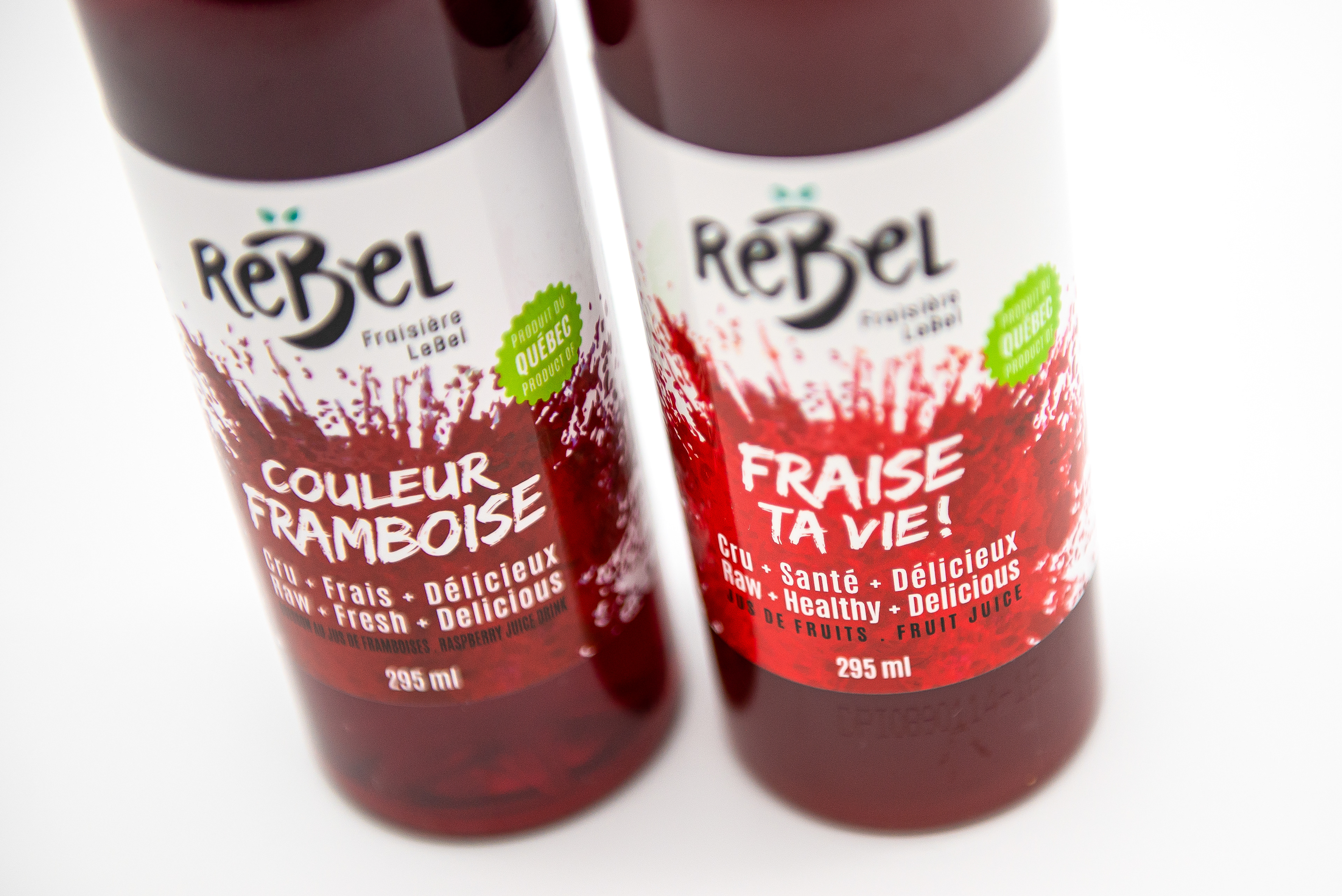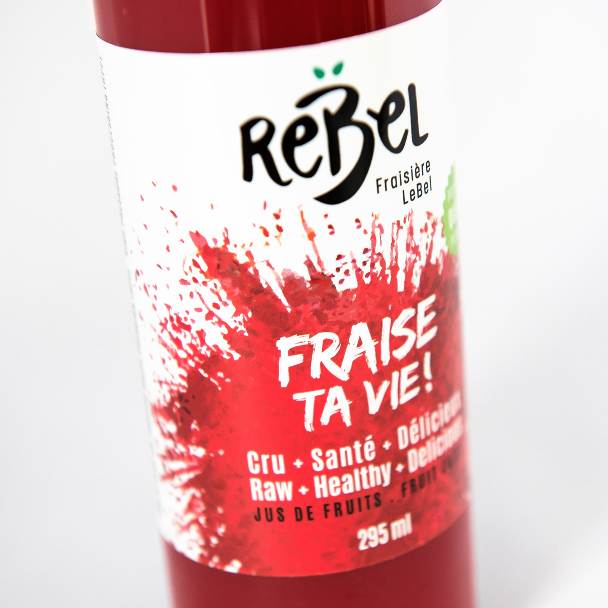 Création de 2 étiquettes pour les jus de fruits de la Fraisière Lebel, sous la marque Rebel