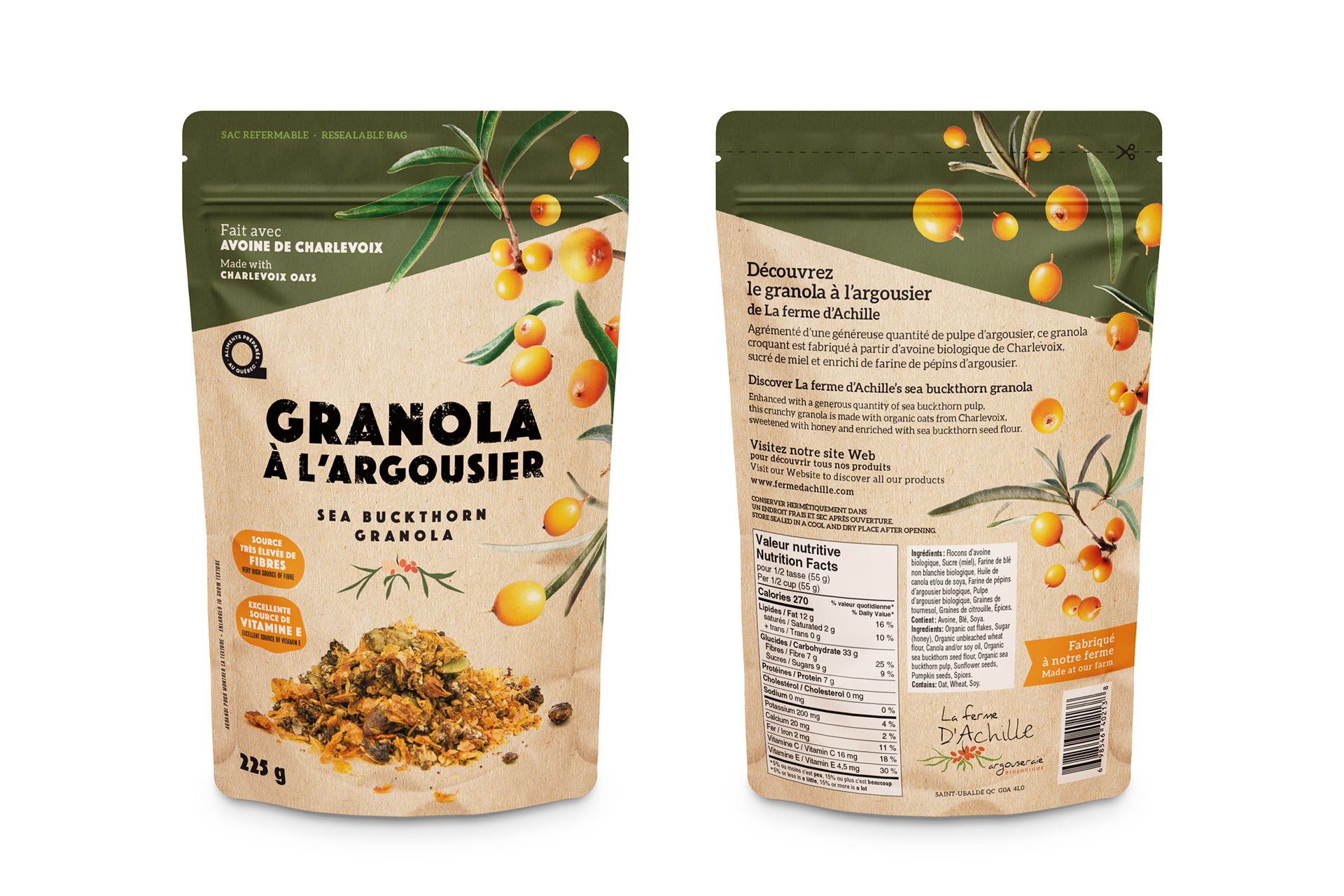 Création de sacs Stand Up Pouch pour les baies et le granola de la Ferme d’Achille